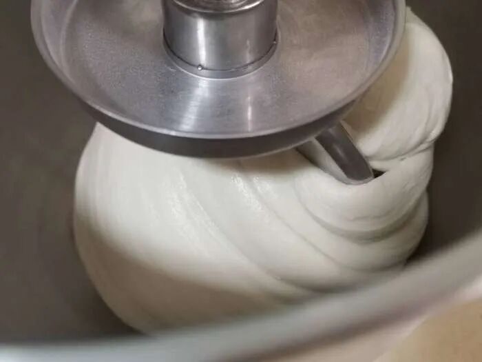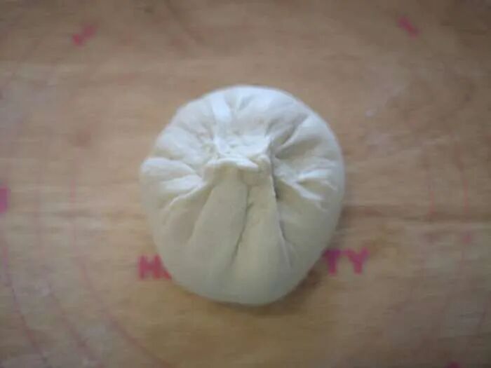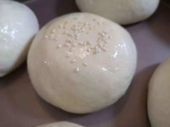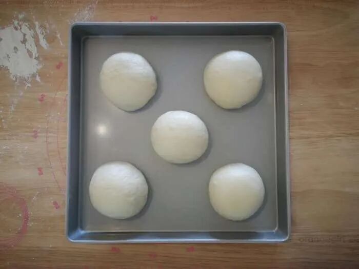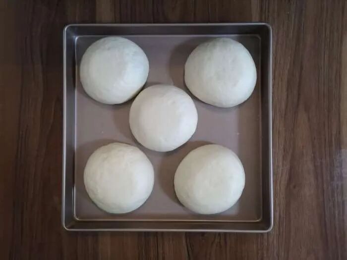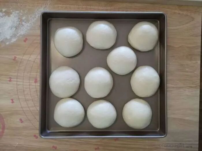 3、加入软化黄油,先低速搅打吸收,高速搅打约2分钟至出现手套膜状态。4、移至案板稍加整理光滑后均分10份,每份约98克。5、静置10分钟,擀扁包入馅料约60克,封口朝下滚圆后稍按扁,依次整理完毕。 6、装入烤盘,保持间距,一次发酵约30分钟。