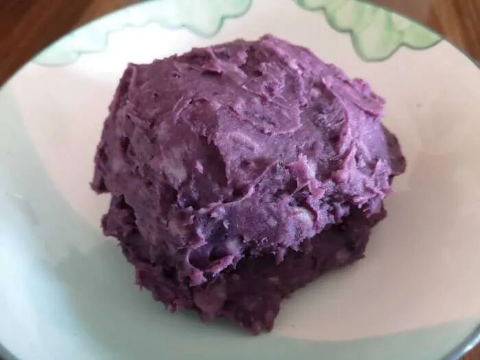 1、将紫薯和芋头去皮切片,上锅蒸15分钟,趁热加糖捣成泥,贴面盖保鲜膜,放凉备用。2、将除黄油外的材料加入厨师机(没有厨师机可以直接用手揉面团),低速搅打成团后,转高速至粗膜状态。![]()