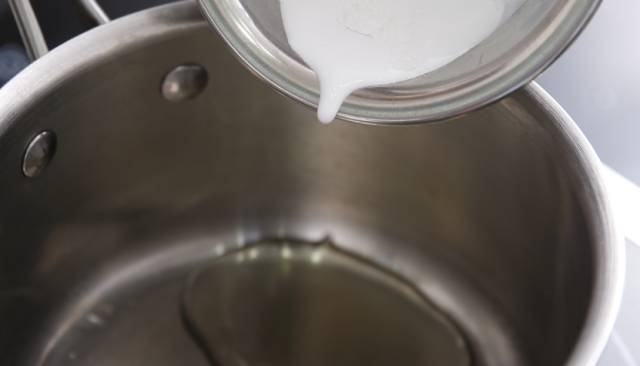 2.把牛奶、淡奶油和葡萄糖浆放入锅中煮沸,离火。