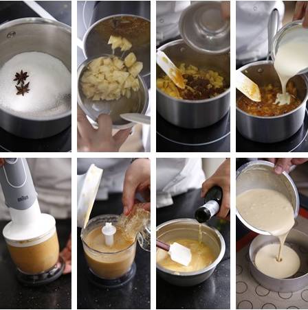 2.将香草棒对切刨开,取出香草籽,与幼砂糖、适量的水一起熬煮。同时打发蛋黄。当糖浆熬煮到118℃时,冲入蛋黄中,继续打发。