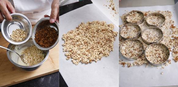 1.先将模具底部挤满椰子香料巧克力慕斯,稍稍冷藏凝固后,在上面放上冻好的焦糖椰子菠萝奶冻。
