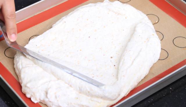5.将“步骤4”倒入烤盘中,用抹刀抹平,入烤箱烤制10~12分钟。