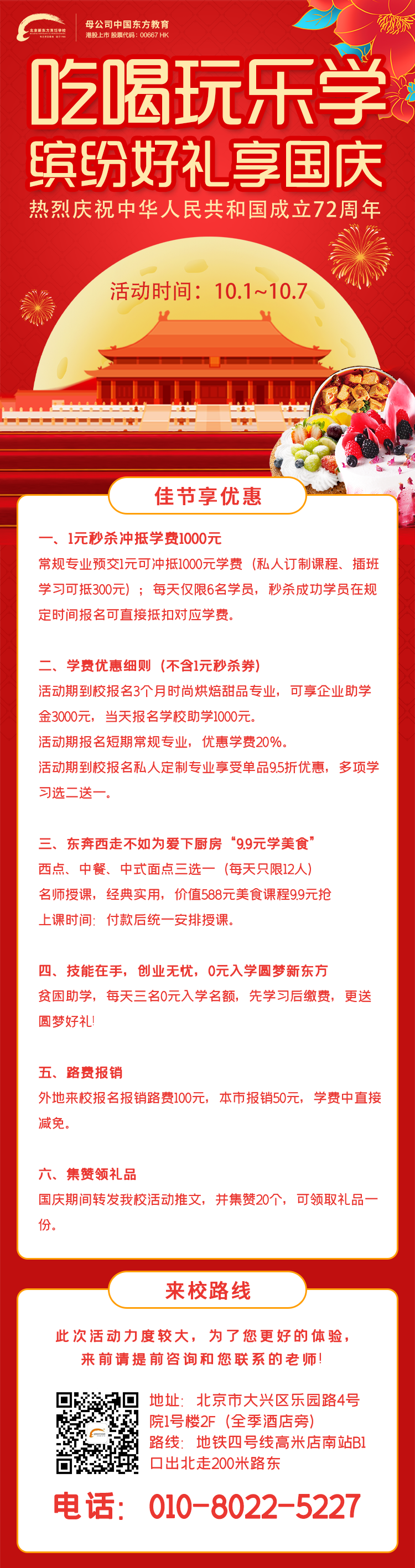 北京新东方烹饪大兴校区隶属于新华教育集团(母公司中国东方教育,港股上市,股票代码00667HK),是经人力资源和社会保障局批准的以烹饪教育为主,涵盖西点教育、西餐烹饪教育、中餐烹饪教育等多个专业层次的大型烹饪专业学校,拥有实力雄厚的教育网络和资源,学校采用“技能+素质+学历”的教学管理模式,让你在这里一份努力,三份收获。