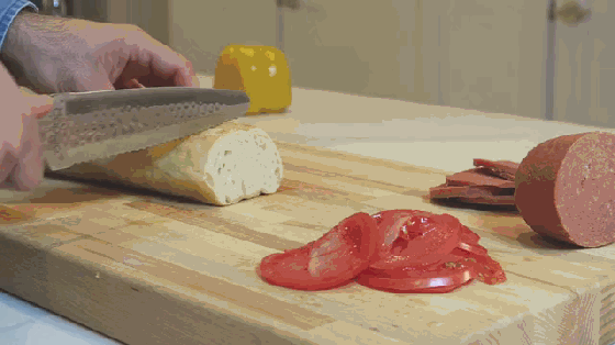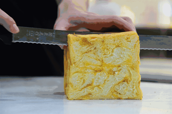 道具的温度使面包的组织软化了,变得不再硬脆,故可以很容易地把面包分片而不至于掉落许多面包渣出来。