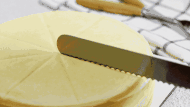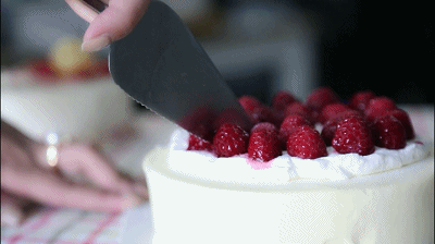 一般的蛋糕我们都会使用大号的锯齿刀进行切割、分片,利用“锯”的方式来回将蛋糕切片。