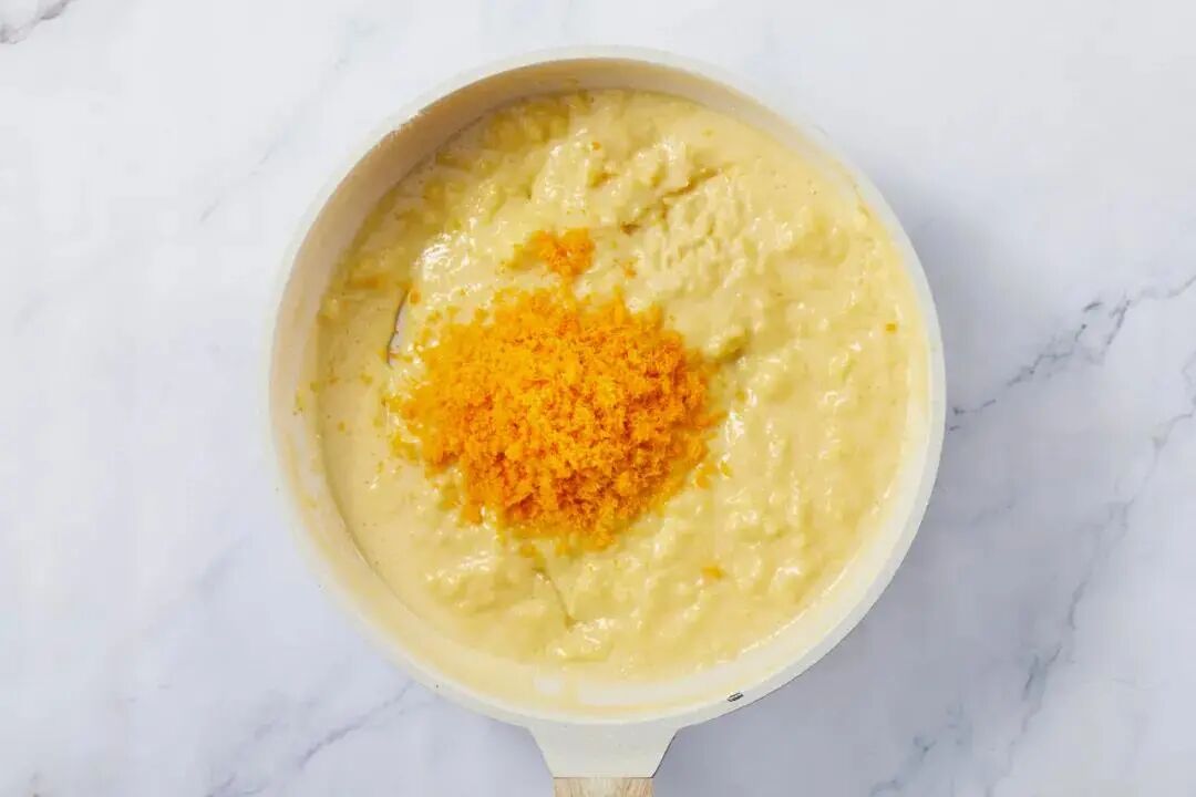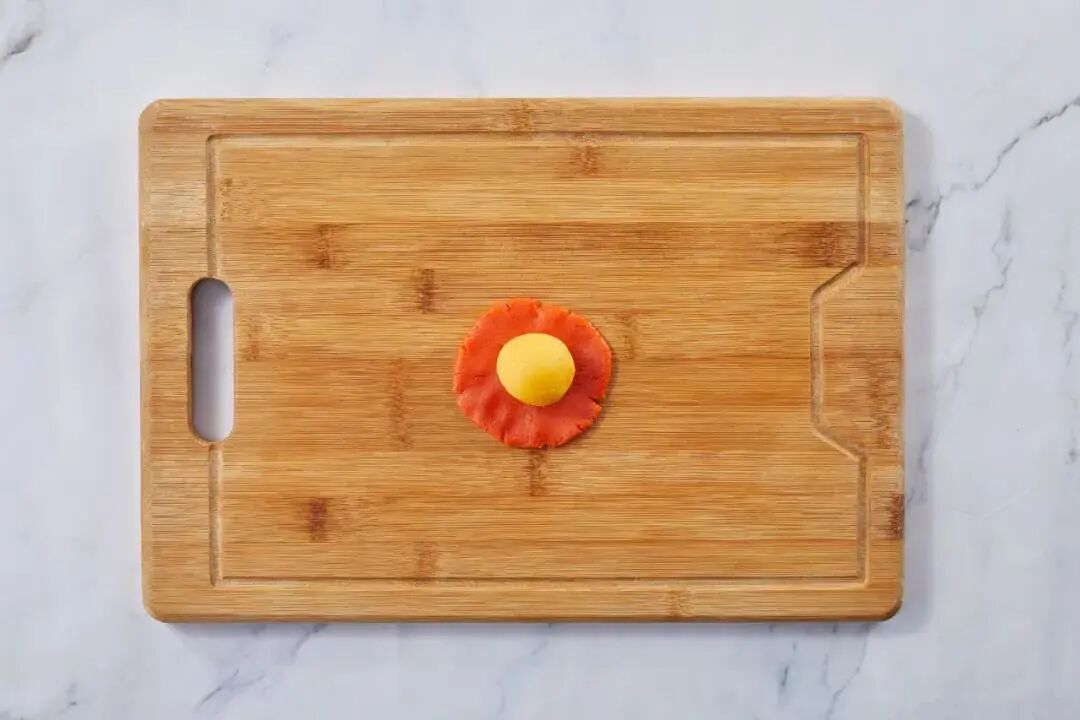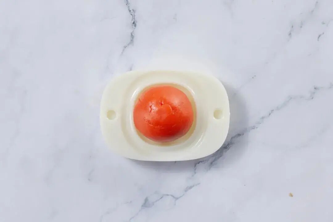 13/15再将橙色面团摊平,包入奶黄馅,包紧揉圆。