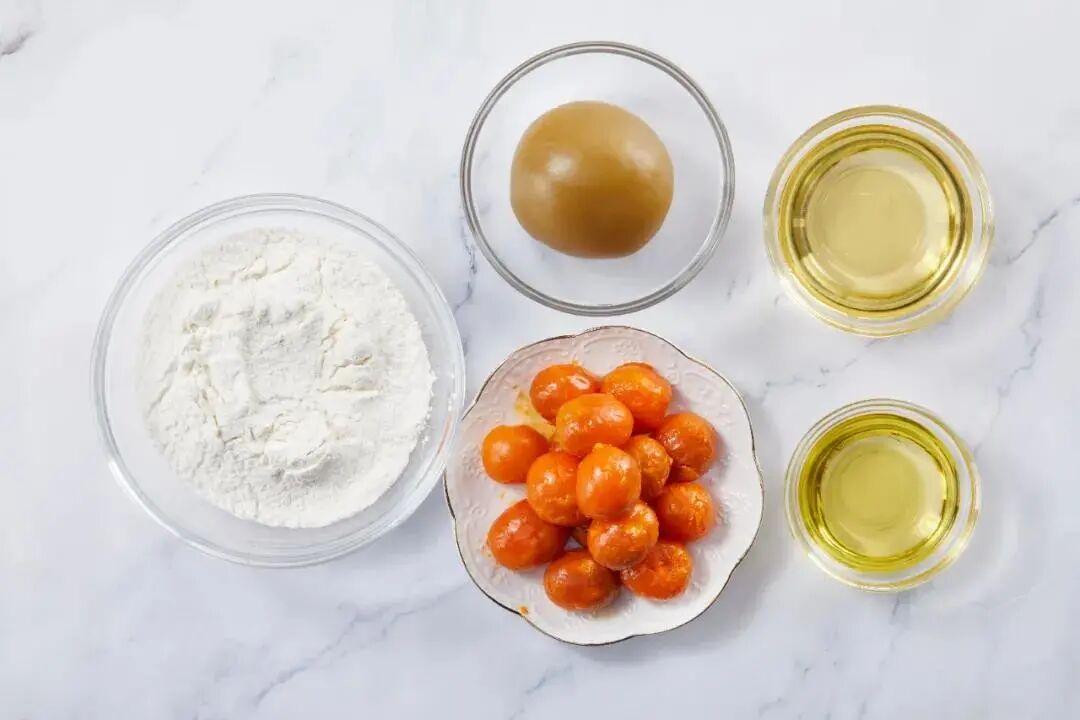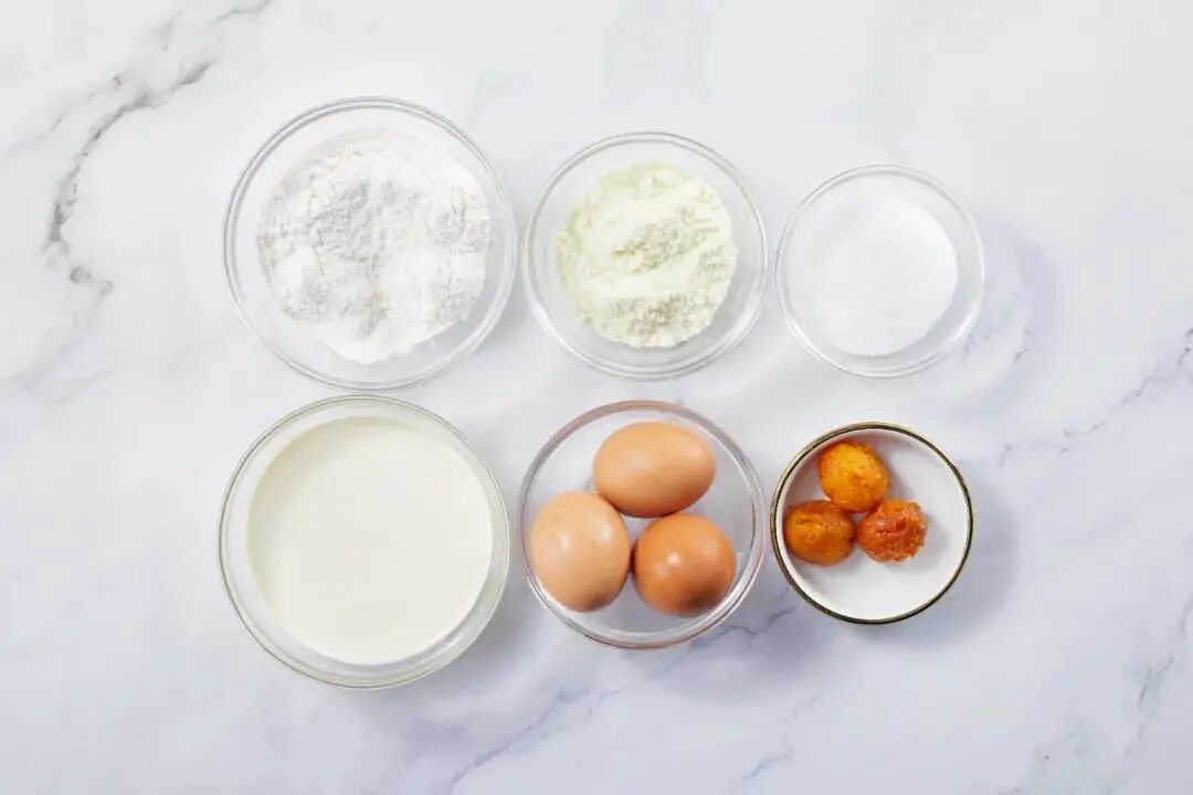 1/8称量准备好所有食材备用。(熟鸭蛋黄:将生鸭蛋黄放入烤盘,喷上白酒放入烤箱180度烤制15分钟。)