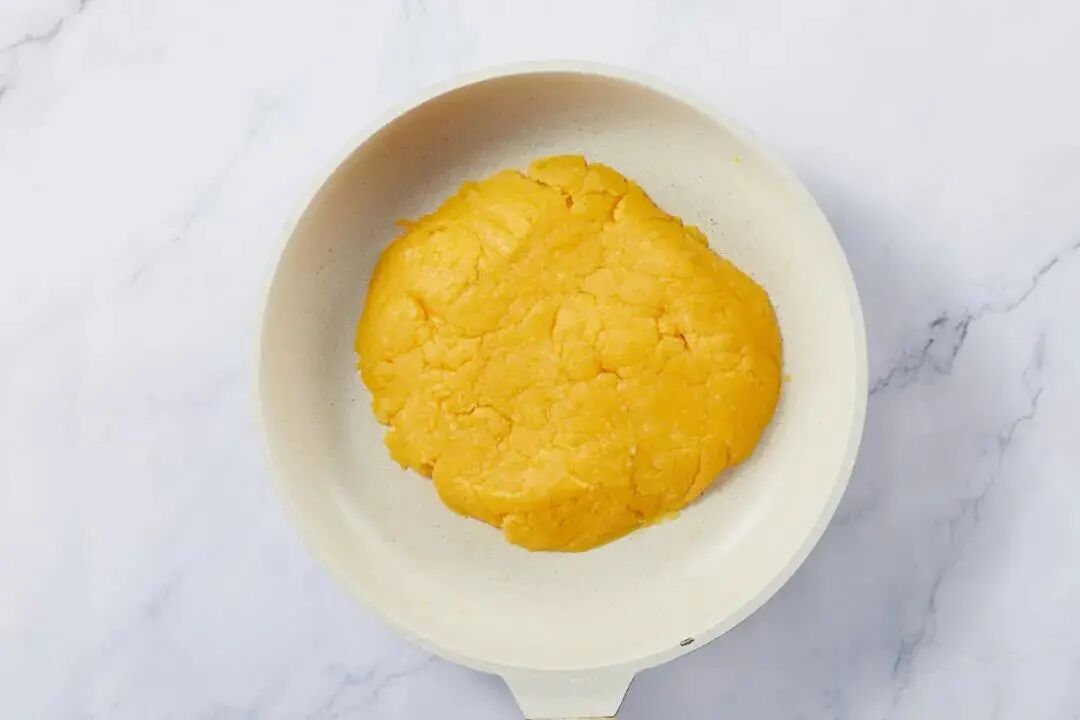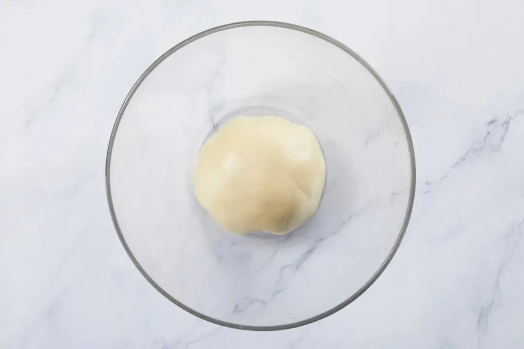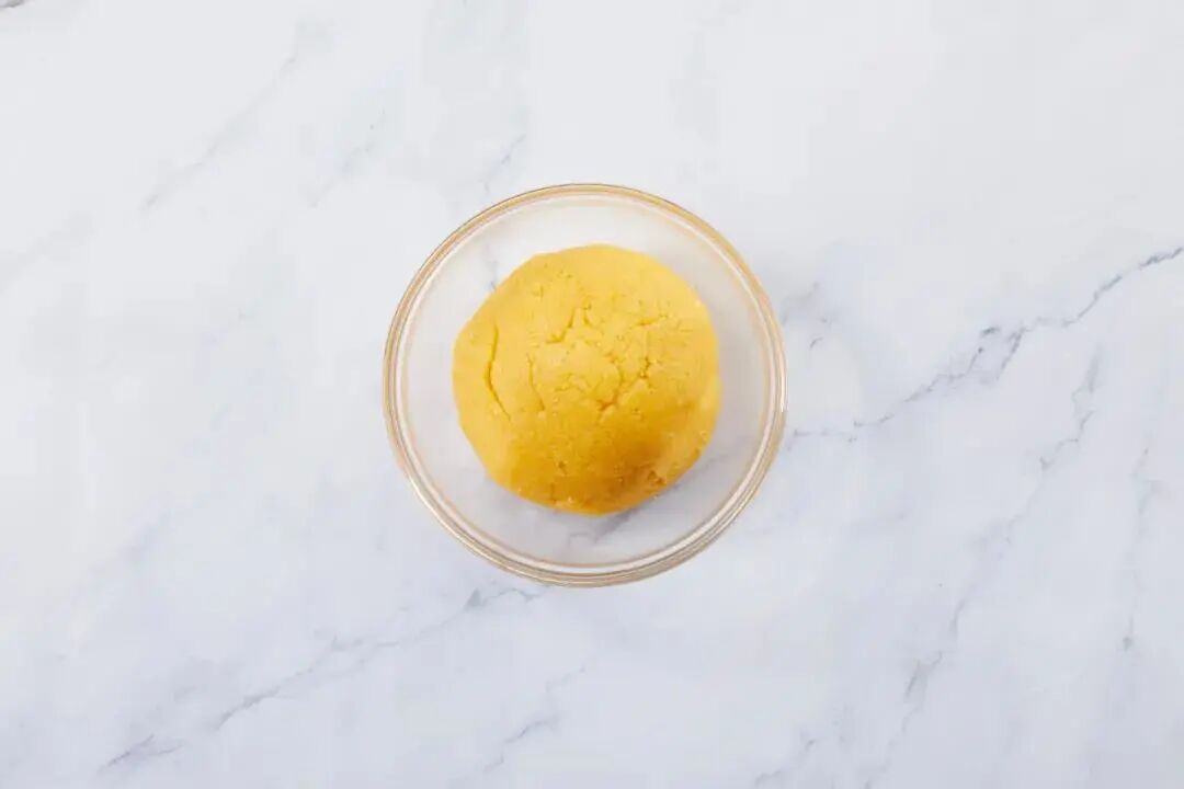 5/15将面团放入碗中,用保鲜膜贴面保存。(奶黄馅放入冷藏可保存2天,冷冻可保存两周。)