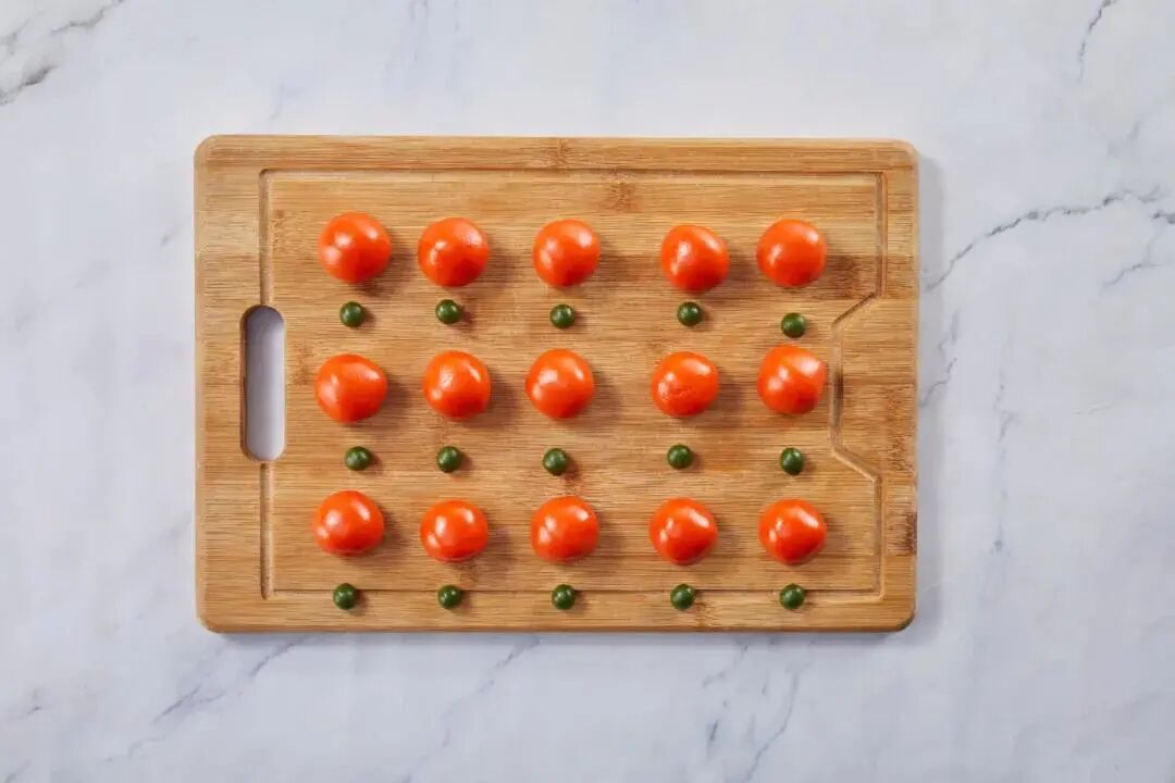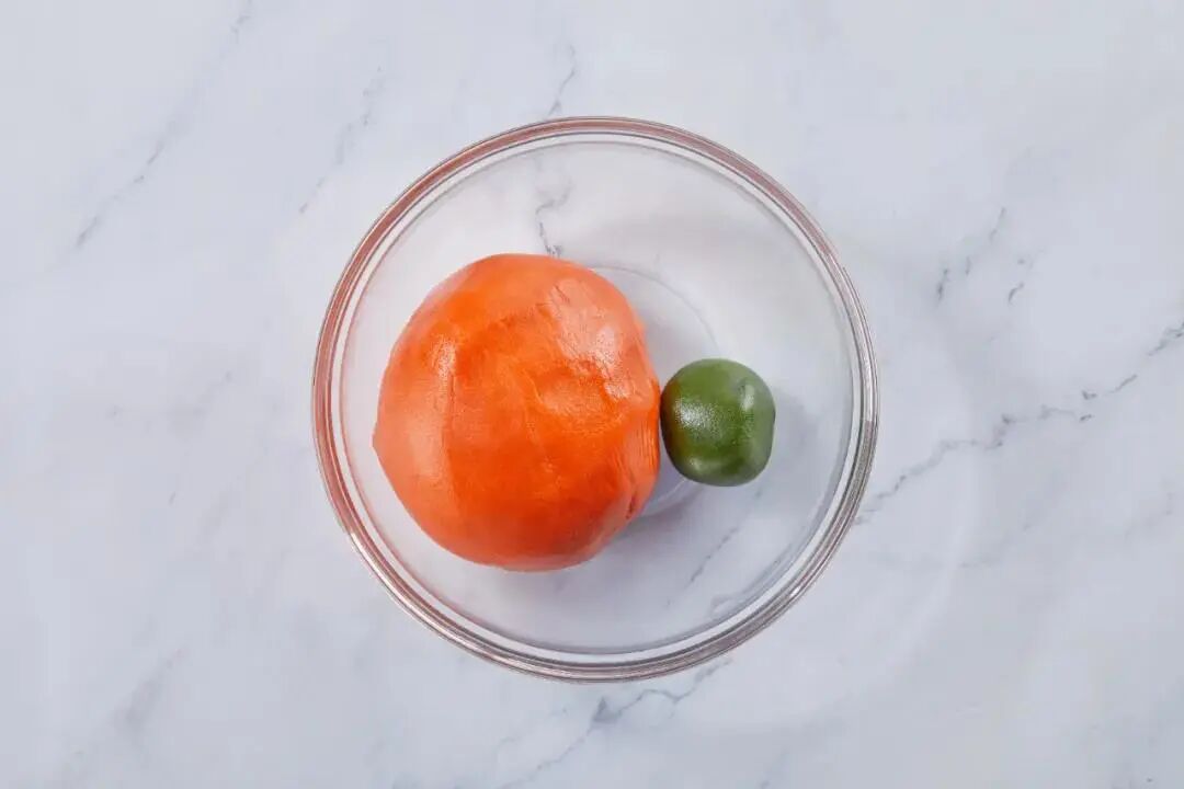 11/15将绿色面团分割成1.5克一个的小剂子,揉圆备用,将橙色面团分割成25克一个的小剂子,揉圆备用。
