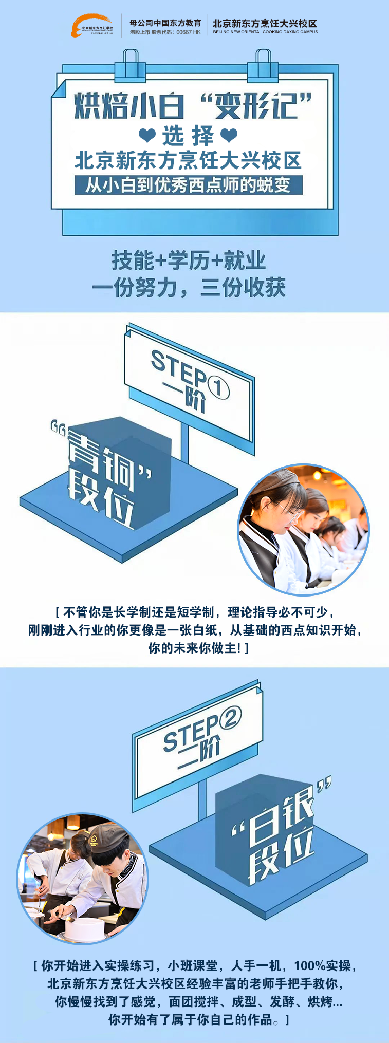 北京新东方烹饪大兴校区三个月时尚烘焙甜点班,课程涵盖西点烘焙的多个类别:甜品、慕斯、面包、饼干等100多款时尚西点,只需三个月,零基础包学会,小班教学,名师指导, 让您从新手小白轻松过渡到西点大师!