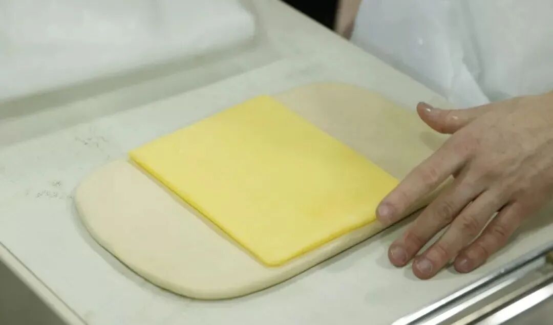 通常情况下,咱们包油会采用四折一次,三折一次的方式。那么对于三折三次的方式,因为折叠的次数较多,时间上花费也较多,略微增加了开酥过程中油与面的软硬度控制的难度。当然,层数越多,油脂的厚度会越薄,相对应的口感上酥脆度会更高一些。包油方式取决于对口感的要求,要求不同,方式就不同。
