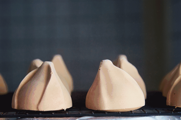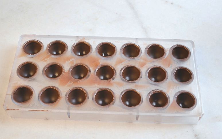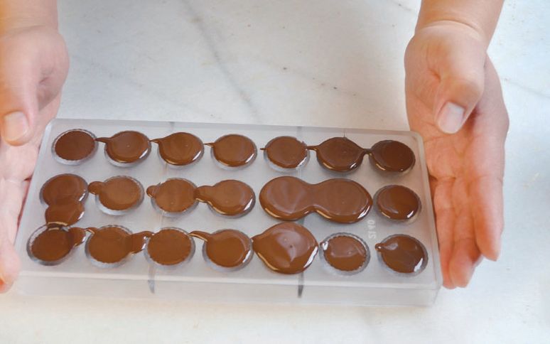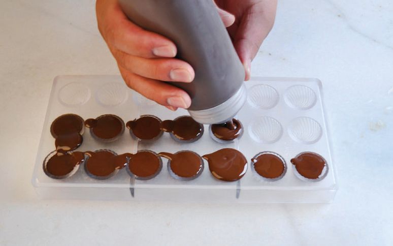 1、用吹瓶将化开的巧克力挤入冷冻过的模具中。