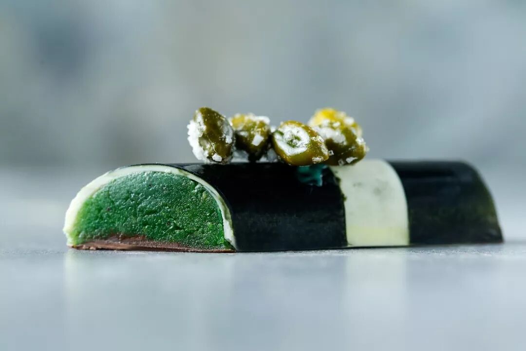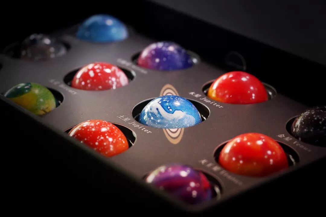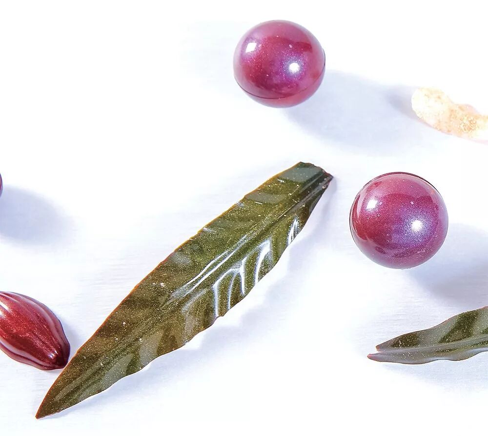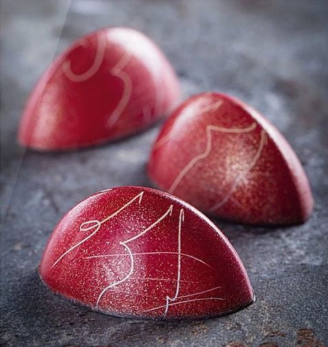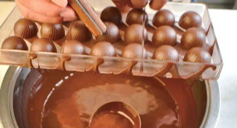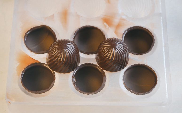 一个好的手工巧克力糖果作品:表面光泽度好,切开后巧克力壳不是很厚,厚薄均匀。