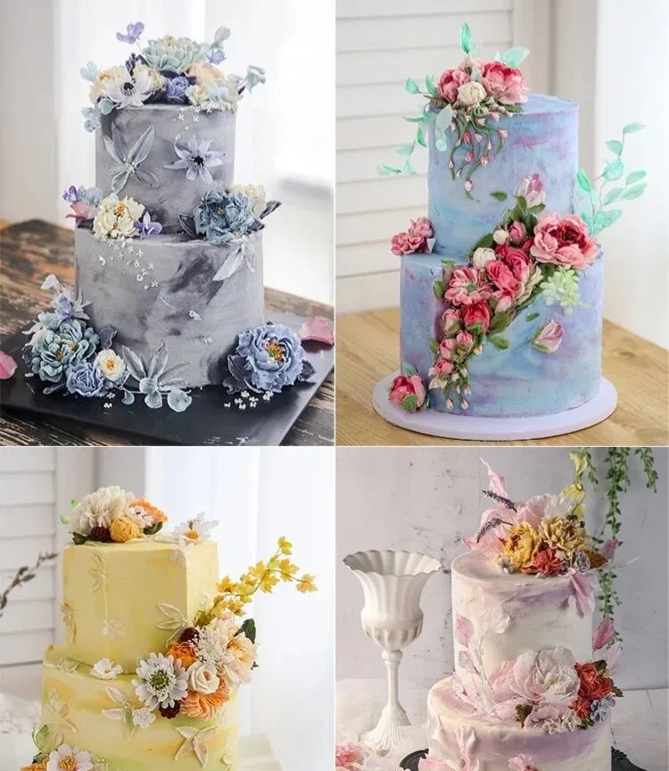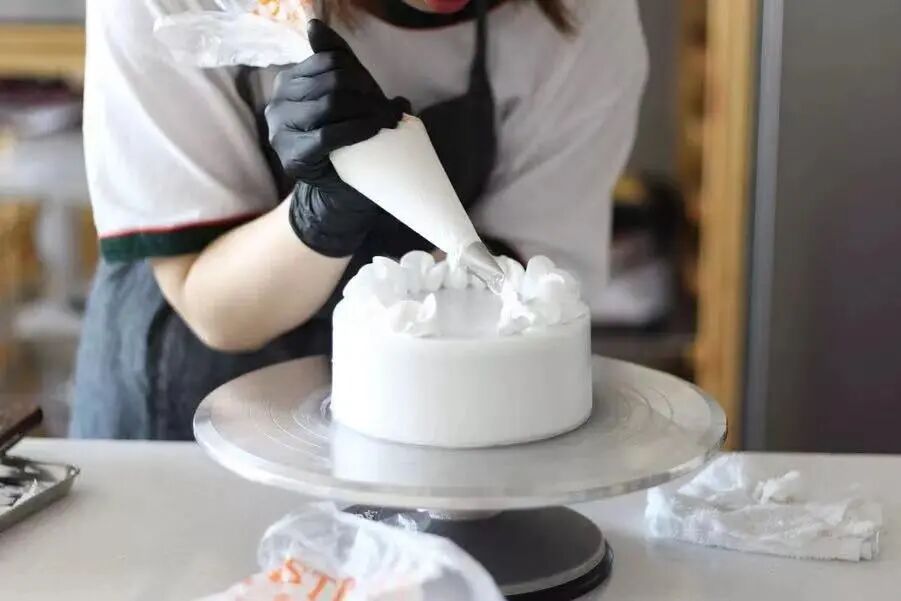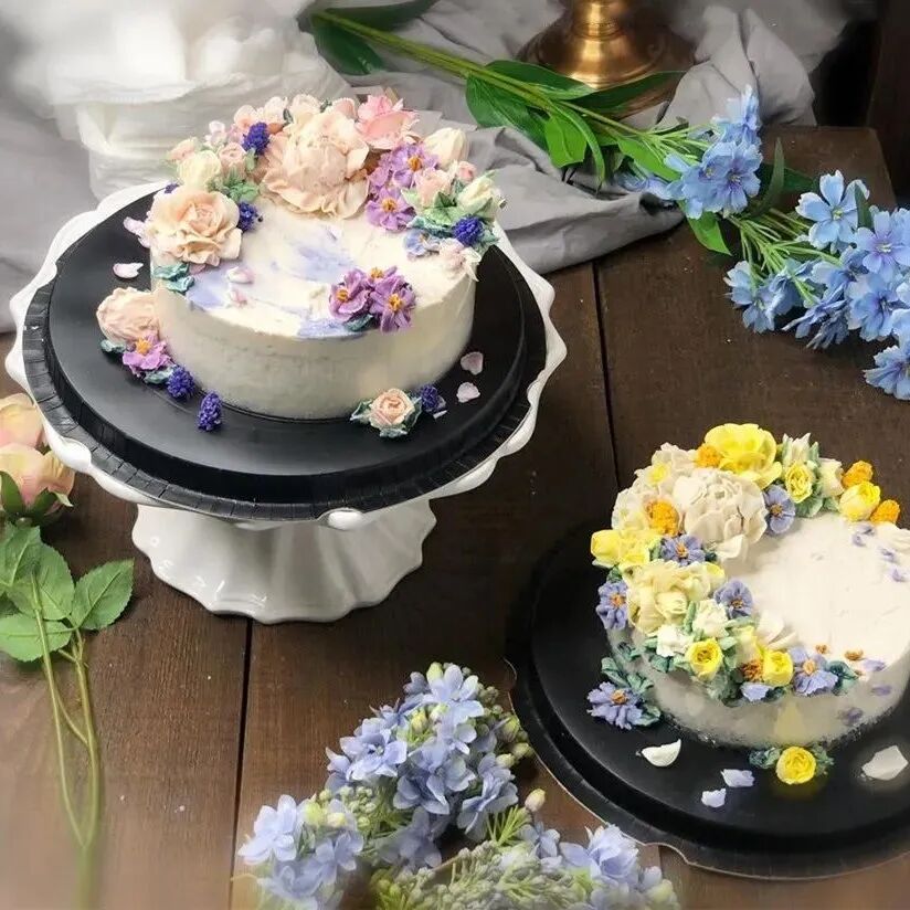 韩式裱花一般常用的蛋糕胚有海绵、戚风和重油蛋糕这三大类,海绵和戚风这两种蛋糕胚的弹性较大,承重能力较小,若是使用奶油霜进行装饰时,奶油霜的量不宜过多,否则蛋糕会被奶油霜压变形。