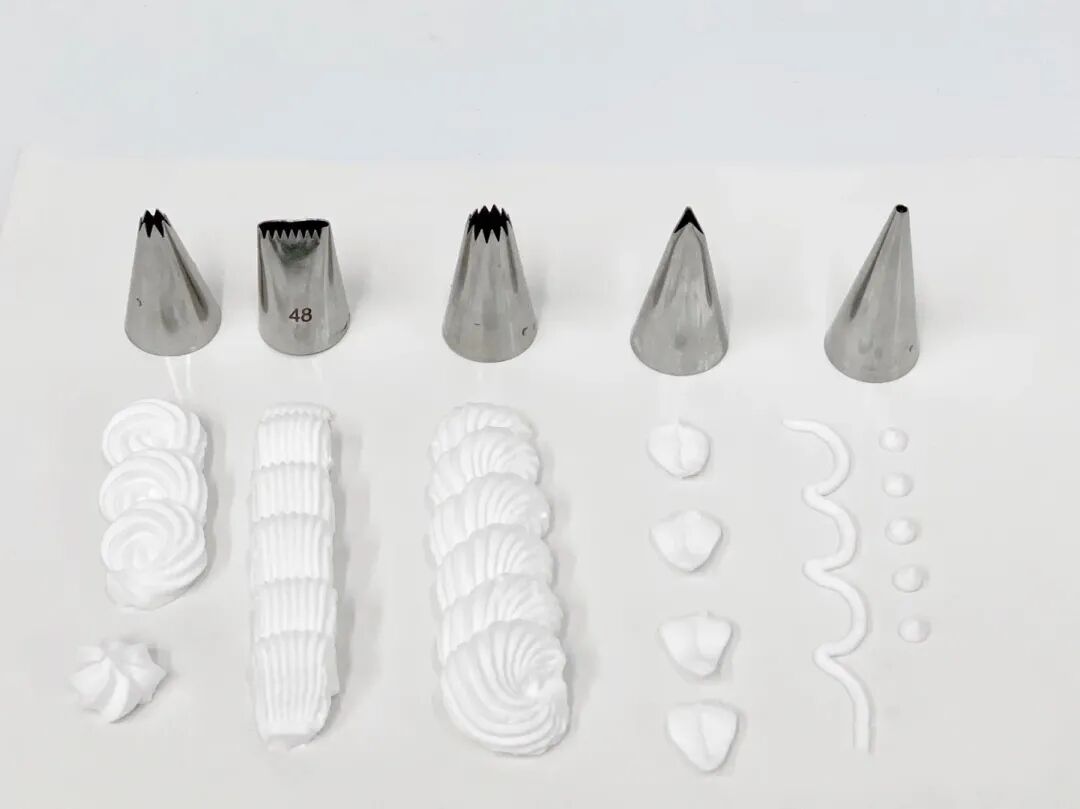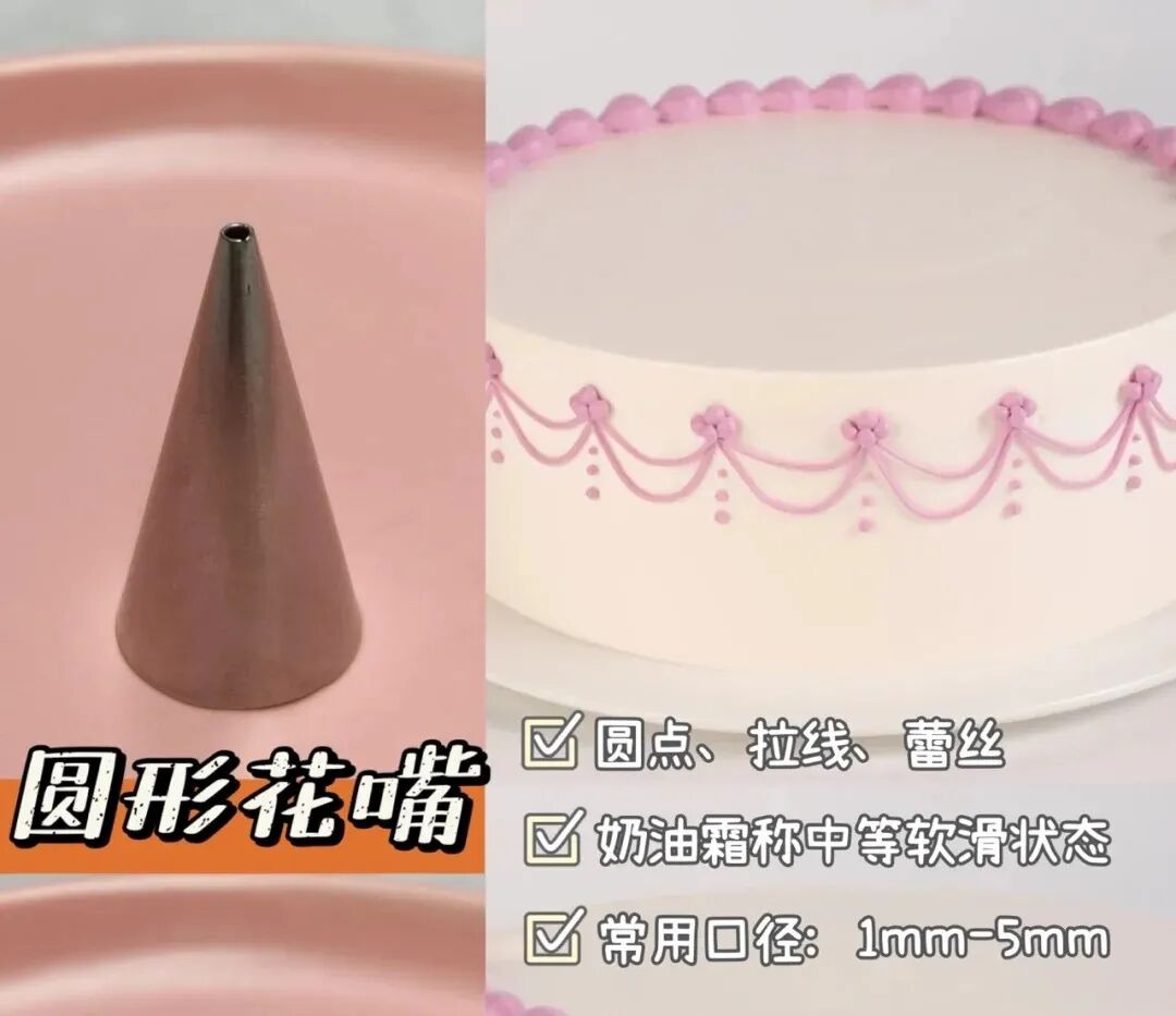 先给大家讲解几款常用的裱花嘴,首先是圆形花嘴,它们的大小不一,主要用来在蛋糕上面写字、描线或蕾丝,也可以用来做泡芙或圆型饼干。
