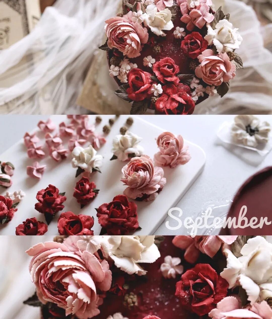 色彩的搭配应该是最难的一项了,完美的配色能赋予蛋糕新的生命,韩式裱花的配色讲究作品整体的协调与平衡,切记色彩不可过于花哨,颜色过于繁杂容易让人产生眼花缭乱的感觉。