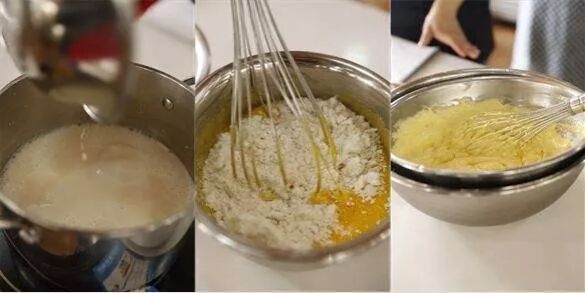 但如果气候潮湿,最好事先过筛,減少失败的概率。蛋黄糊混入粉类之后要一定搅拌均勻、沒有颗粒,接着再加入热牛奶后动作一定要快,否则部分蛋黃糊煮熟部分沒有,也会产生颗粒。