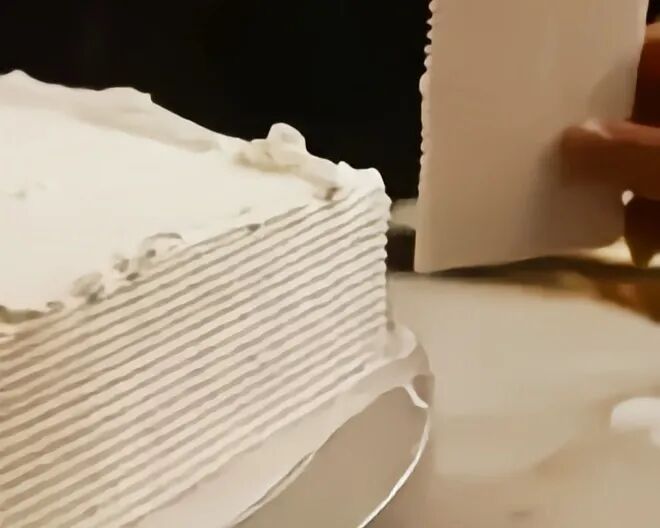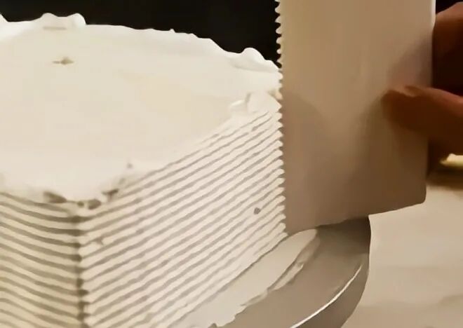 1.铺夹层奶油:在底层蛋糕胚上挖一块奶油,刀头对准蛋糕的中心位置,左手放在点位置轻转转台,倚靠右手腕的力量,将奶油以水平15°抹过去、推回来。2.抹平奶油表面:抹刀刀尖对准蛋糕中心,并保持水平15度,右手不动,左手转动转台,将奶油面抹平。3.叠放顶层蛋糕胚:将顶层蛋糕胚对齐叠放,如果放歪了,一定要调整好。一般会选择最底层戚风蛋糕作为顶层蛋糕胚,因为轮廓较好,蛋糕表面比较平整。4.抹侧面奶油:用刀尖沾取奶油,垂直于转台涂抹,同样右手按照抹刀15度翻面将奶油抹过去推回来,左手轻转转台。5.铺奶油并抹平:由于是最外层的奶油,考虑到之后需要修饰平面,所以要比蛋糕胚夹层奶油更多一些,按照第一步和第二步的方法将表面奶油铺平,并将表面的奶油用抹刀使其自然滑到侧面。6.铺平侧面奶油:抹刀垂直于转台,并保持15度向内翻面,右手保持不动,左手转动转台,将侧面奶油面抹平,这时候顶部的奶油边缘必须高于中心,否则顶部直角出不来。7.抹平顶部奶油:将抹刀外缘与蛋糕垂直点重合交集,轻轻的朝蛋糕中心位置抹平后收刀。8.处理底座上多余奶油:抹刀从右侧向左侧沿蛋糕底划动,抹刀右侧稍稍抬起,旋转转台,将多余奶油刮掉。1.正方形四周依次抹上奶油,抹厚一点,注意,四个角补一下角。2.补完角后,挖点奶油把表面抹平,抹平后,再用一小坨奶油从上面补下来,多余的收走。3.查漏补缺,再抹侧面,刮板垂直于转台,先刮平奶油,接下来精修蛋糕面。4.左手放在图中所示的位置不变只要转盘转半圈,刮到这条的尽头即可。5.刮到尽头时,刮板还要继续向前走直线将刮下来的奶油从蛋糕体上带下来。接下来刮每一个角都是步骤3—4的手法。6.刮顶部时,刮板与蛋糕面的角度为30度,把侧面高起的奶油,从边缘向中间刮过去。7.刮片放的位置除了角度外,刮板下移的位置也很重要,这一点决定能不能做出清爽的直线。8.刮平顶部奶油时,要将面分为几等分来刮,每刮一下都要从边缘开始向蛋糕的另一边刮。在刮顶部面时,每刮一次面接头点都放在一个方向(位置),这样装饰起来只要遮一边即可,蛋糕整体看起来就会很细致。