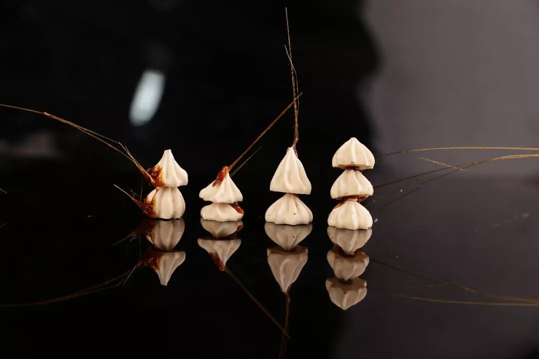 通常使用香气鲜明的原料,如柠檬汁、酒类、茶等材料,以及薄荷、罗勒、香茅等香料。口感材料则相当于慕斯中的小彩蛋,鲜明的差异感会让食客眼前一亮。