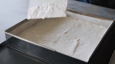 制作完的蛋糕糊要从20cm左右的高处倒入烤盘,这样有利于将面糊内部大的气泡排出。