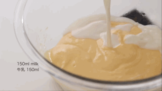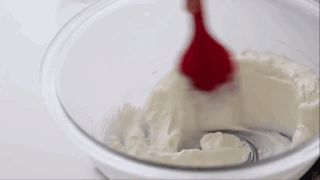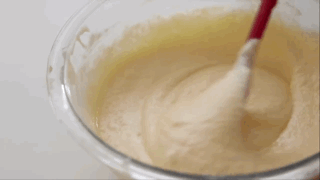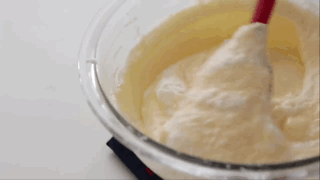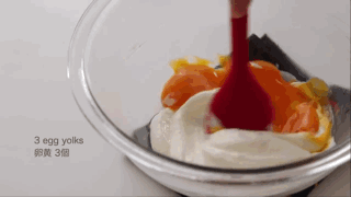 ▲将蛋白霜分三次与酸奶面糊翻拌均匀。