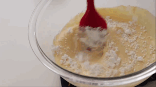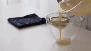 ▲因为低粉与玉米淀粉较难于酸奶混匀,所以我们将它过筛一下,就得到了酸奶面糊。