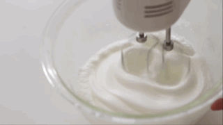 ▲3个蛋白打发至硬性发泡,拉起有直立的钩角。记住糖分三次加入哦,刚开始的鱼眼粗泡、细泡、有纹路时各加一次。