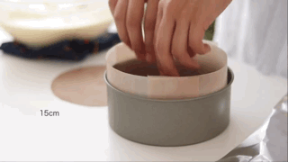 ▲取6寸蛋糕模具,剪好烘焙纸围绕一圈,再剪一个圆形烘焙纸在底部垫上。