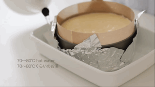 ▲将酸奶舒芙蕾液倒入模具中,震动几下,放入烤盘中,然后往倒入烤盘2CM热水(热水温度一般是70-80度左右哦)