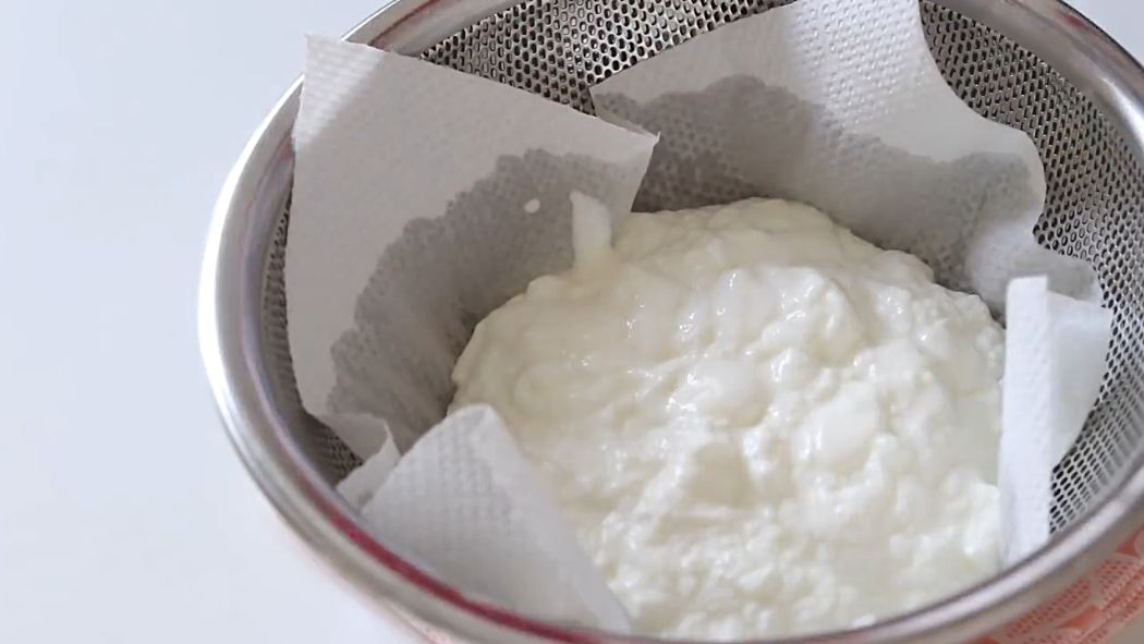 ▲操作步骤是这样的:取一个筛网架在空盆上,筛网里垫一张厨房纸巾,然后倒入酸奶,再盖上保鲜膜放入冰箱冷藏沥水24小时。一定要用厨房纸巾,比较结实、吸水性又好。