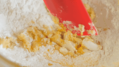 2.切拌:切拌法是像切割食材一样朝下切拌均匀。切拌法通常用在油蛋混合物和面粉的混拌中,例如饼干、磅蛋糕、挞派的制作。 -->