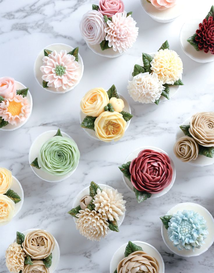韩式裱花是韩国的家庭主妇在惠尔通裱花的基础上进行改进的,它的精髓在于奶油霜的制作,她们通过各种材料的精准配比和严格的室内空气温度控制,对自己的裱花手法进行举一反三,稍微变化一下就能制作出各式各样的栩栩如生的奶油花。