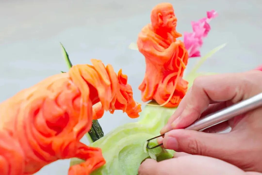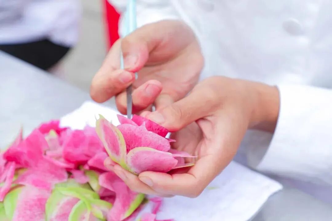 在学习期间,他对果蔬的雕刻产生了浓厚的兴趣,这种兴趣给了他很大的学习动力。老师在讲解知识点时,他在大脑里面不断地预演,琢磨怎么能雕得又好又快。![]()