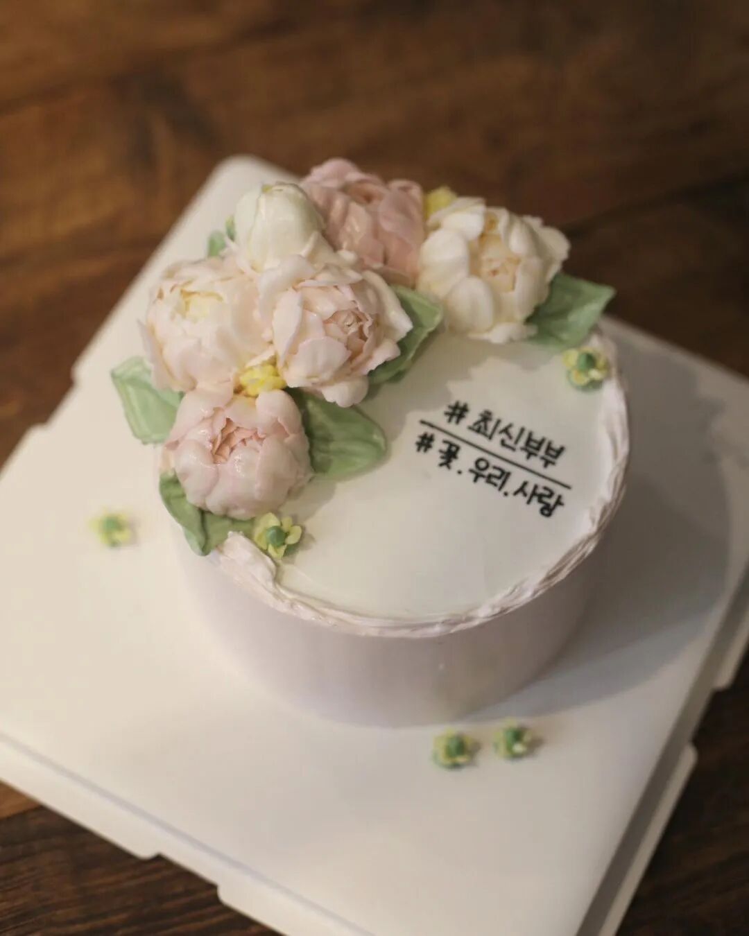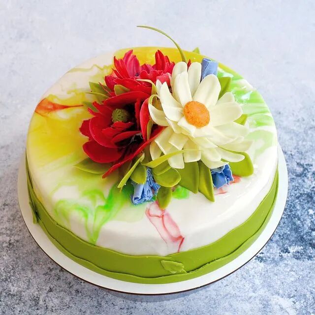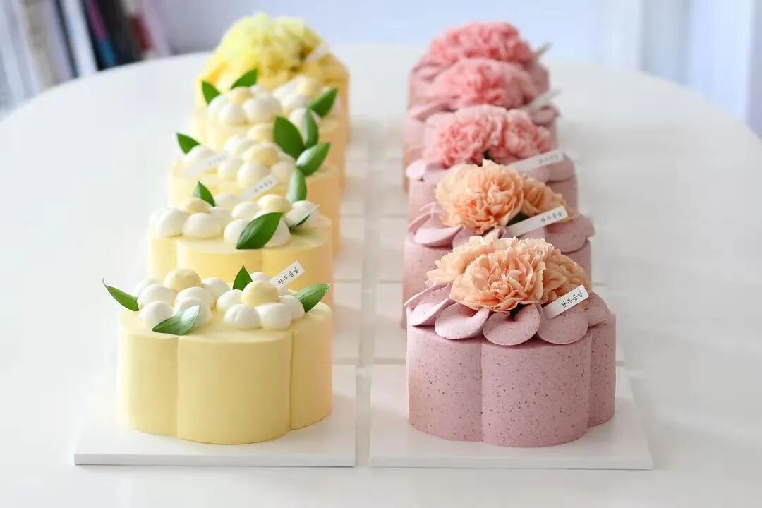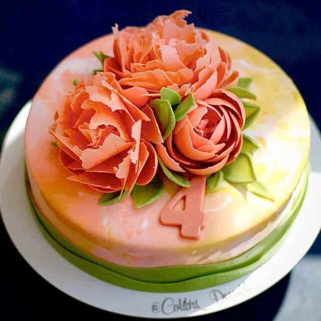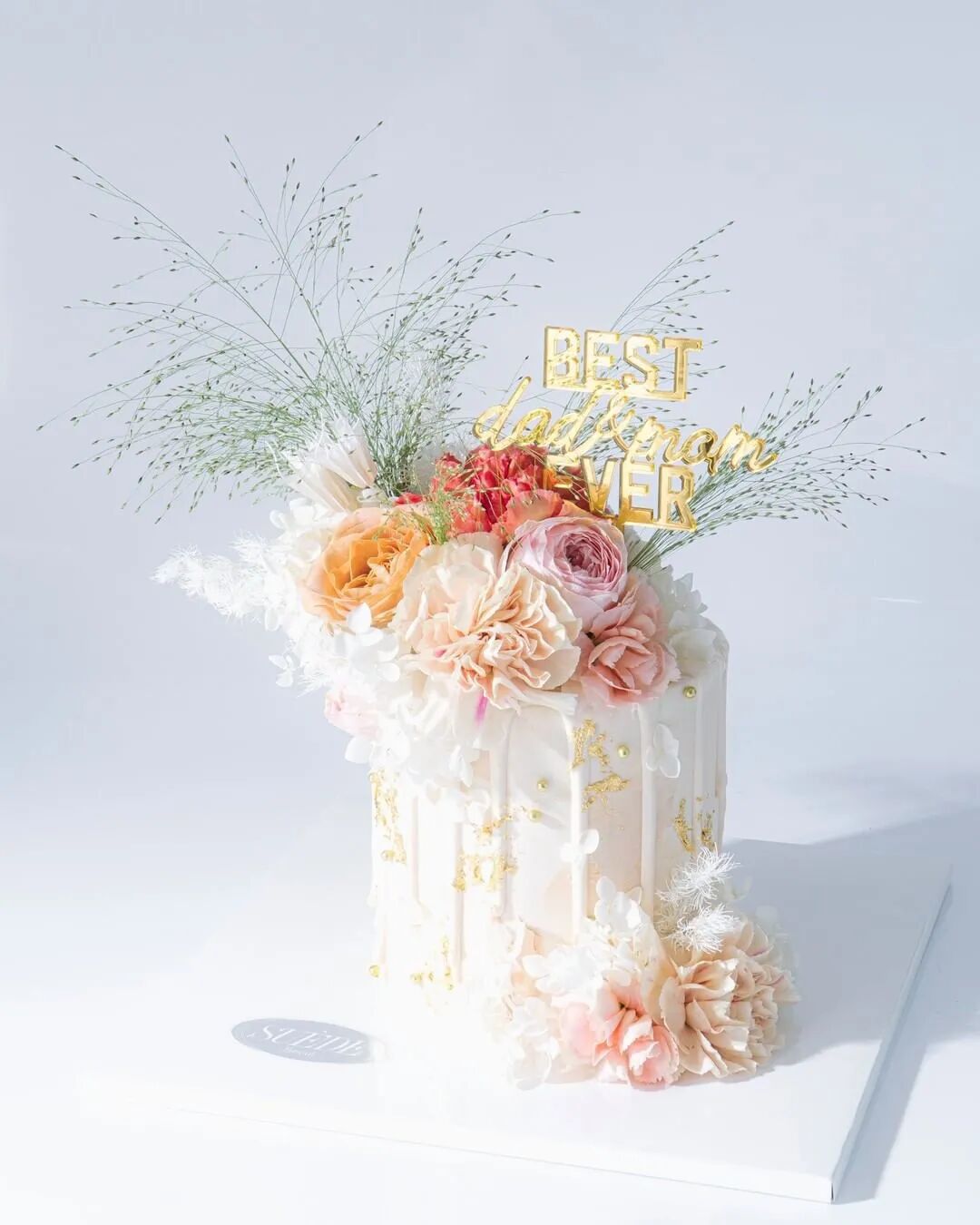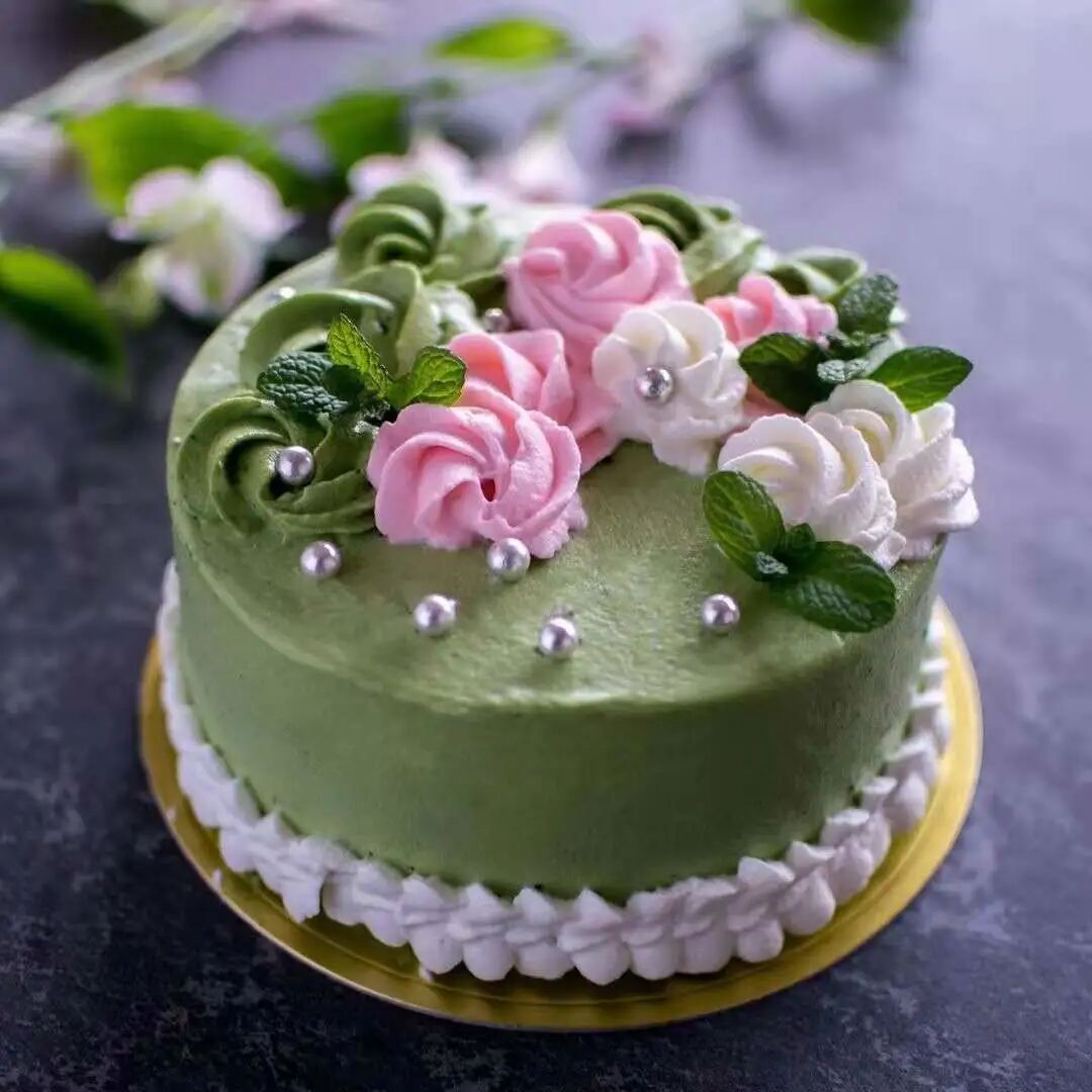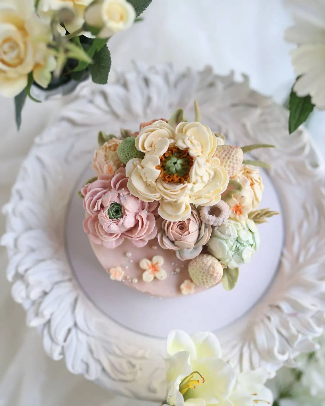 蛋糕上点缀着奶油花、巧克力花或可食用花卉