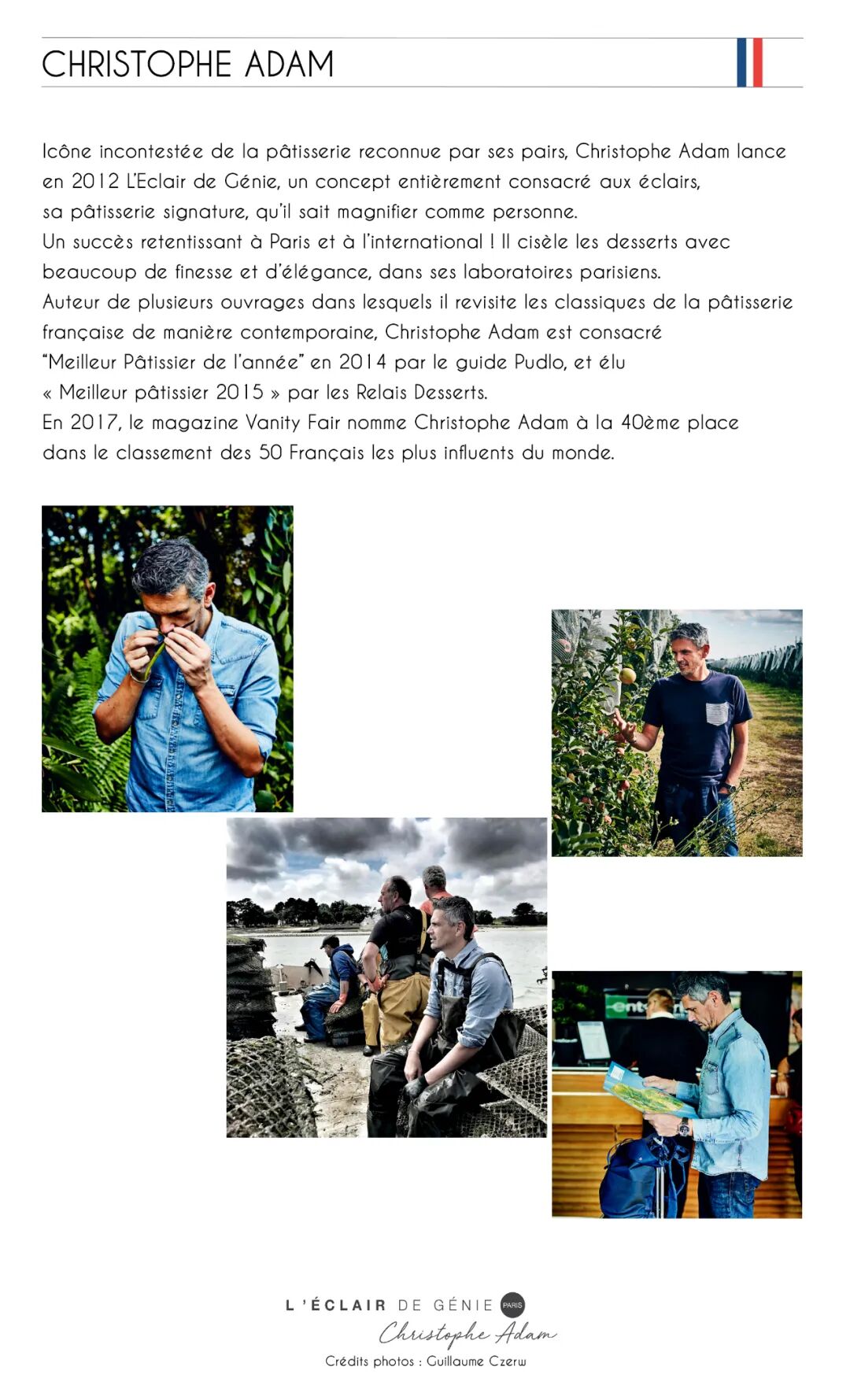 在酒店工作了两年后,Christophe Felder邀请他来到Crillon从事甜点研发工作,从此他在甜点的道路上一直朝着高端华丽的方向发展。三年后,到国外游学研修,1996年,他回到巴黎,进入Fauchon工作,长达十几年之久,期间一直担任甜点创意总监。他在Fauchon工作期间开发出了各种新颖炫目的闪电泡芙,将店铺的传统法式甜点推向了前所未有的新高度。2012年12月,他创办了自己的店铺——L'Éclair de Génie,开业至今一直广受好评。2015年,被《Meilleur pâtissier 2015》评选为“2015年最佳甜点师”称号。2017年,在《名利场》杂志“全球最具影响力法国人50强”中排名第40位。作为一家闪电泡芙老店,L'éclair de Génie在巴黎有九家分店,每一家都是简洁的白色装饰,橱窗上的窗花会根据主题变化,从店外就能感受到空气都弥漫着甜蜜的因子。走进店内,放眼望去是各种口味的闪电泡芙、巧克力、水果挞以及泡芙冰淇淋,仿佛进入了一个梦幻的甜蜜世界。巴黎总店的闪电泡芙多达几十种口味,它们整齐地排列在橱窗中,每一种都爱不释手,每一种都看上去超级美味。不禁让人犯起了“选择困难症”,真想要All In!闪电泡芙是法式甜点的代表,这家店的闪电泡芙在裹满巧克力或果酱的泡芙表面,用坚果、水果和小糖果进行点缀,一个个闪电泡芙精致如艺术品。入口则能感受到浓郁的香草或巧克力奶油,简直太满足了!L'éclair de Génie店内也有马卡龙售卖,装在简洁的包装盒内,非常适合作为伴手礼赠送。巧克力也是一大特色,虽然来到这里的大多数顾客都是为了闪电泡芙而来,但是走的时候却会带走很多其他的美食,因为每一样都很好吃啊!L'éclair de Génie的店铺logo就像是一个装点着不同口味水果和巧克力的闪电泡芙,非常显眼,让顾客远远地就能看到。短短几年的时间,L'Éclair de Génie从巴黎开到了世界各地,如今日本、意大利、加拿大、俄罗斯、中国等各个国家都能享受到诱人的闪电泡芙。另外,L'Éclair de Génie还特别推出了迷你版的小闪电泡芙,若想要多尝几种口味又怕吃不完的话,迷你版的闪电泡芙是不错的选择。
