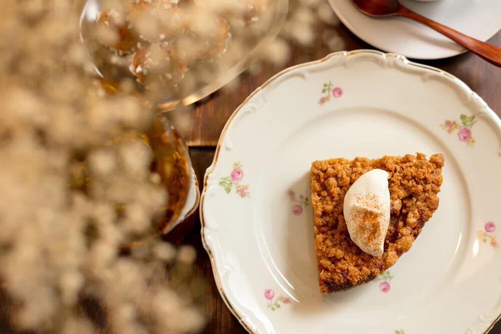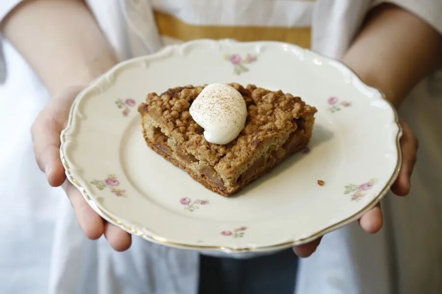 外形与口感兼具的泡芙,着实让人忍不住一个接一个,吃到停不下来,从开店到现在一直没有换新或者改变。产品层次:杏仁奶油、肉桂焦糖苹果、黑糖酥粒、酸奶鲜奶油带着咸味的塔皮中,加入烘烤过的带皮杏仁磨碎,卡仕达酱做成的杏仁奶油制作成内陷,黑糖肉桂酥粒上点缀上酸奶鲜奶油,平衡苹果塔的甜度,也增加湿润的口感。