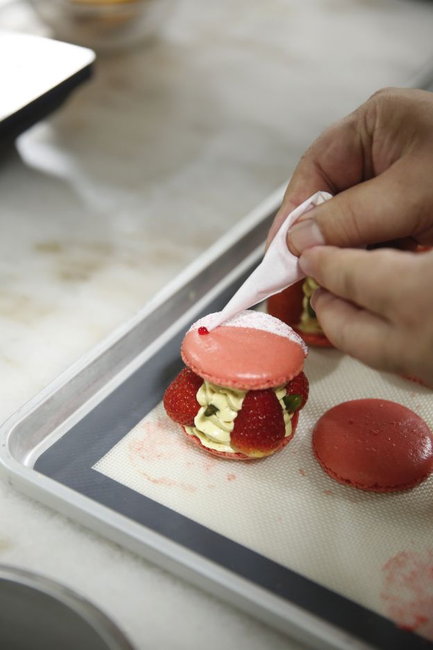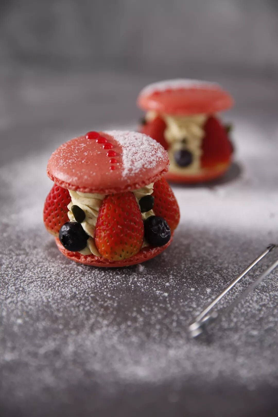 1、取一片马卡龙,挤上开心果黄奶油,放入一颗草莓,再挤入一层开心果黄奶油盖上另一片马卡龙。