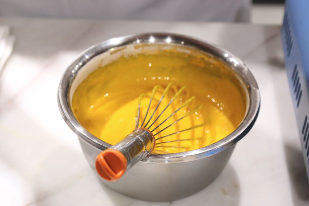 4、加入开心果酱、黄油和樱桃白兰地搅拌均匀,加入打发的蛋白霜搅拌均匀;装入套有锯齿裱花嘴的裱花袋中,备用。