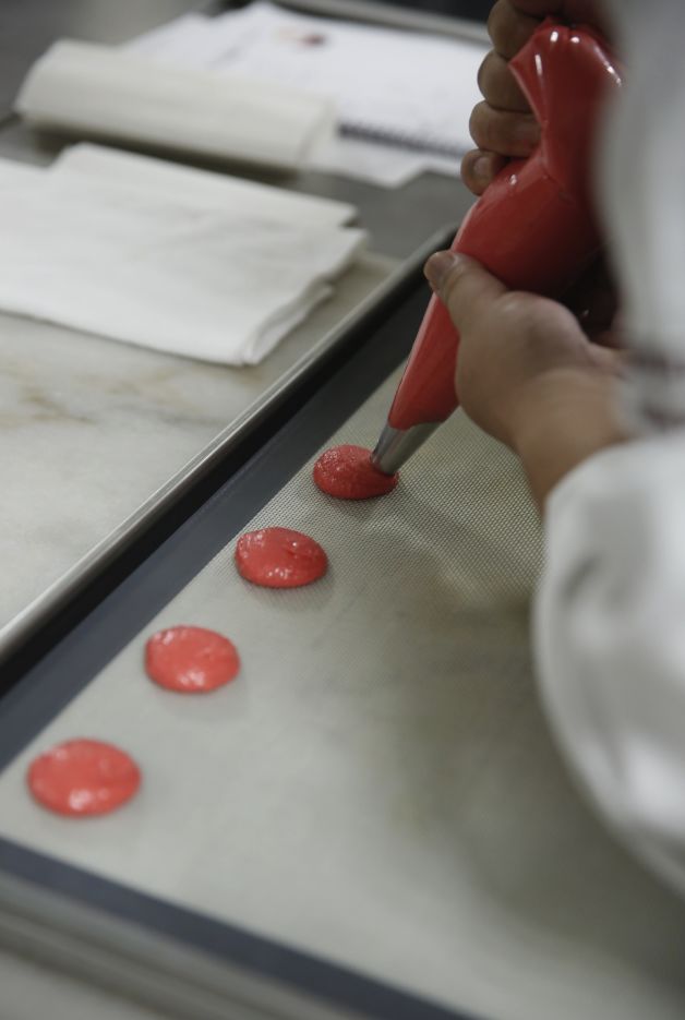 2. 加入过筛的糖粉、扁桃仁粉和少许食用色素(红),用橡皮刮刀压拌均匀,装入带有圆形裱花嘴的裱花袋中。