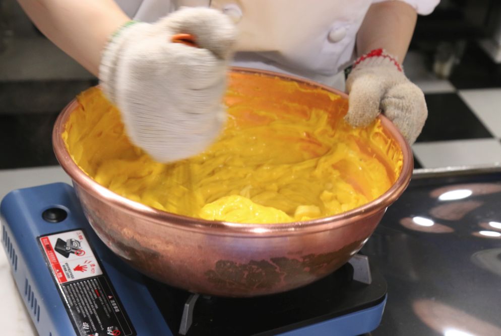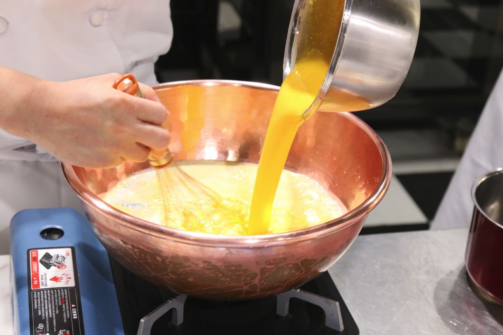 2、将细砂糖(2)、海藻糖和水倒入锅中煮至115℃,缓慢加入打至湿性发泡的蛋白中,继续打发成蛋白霜备用。