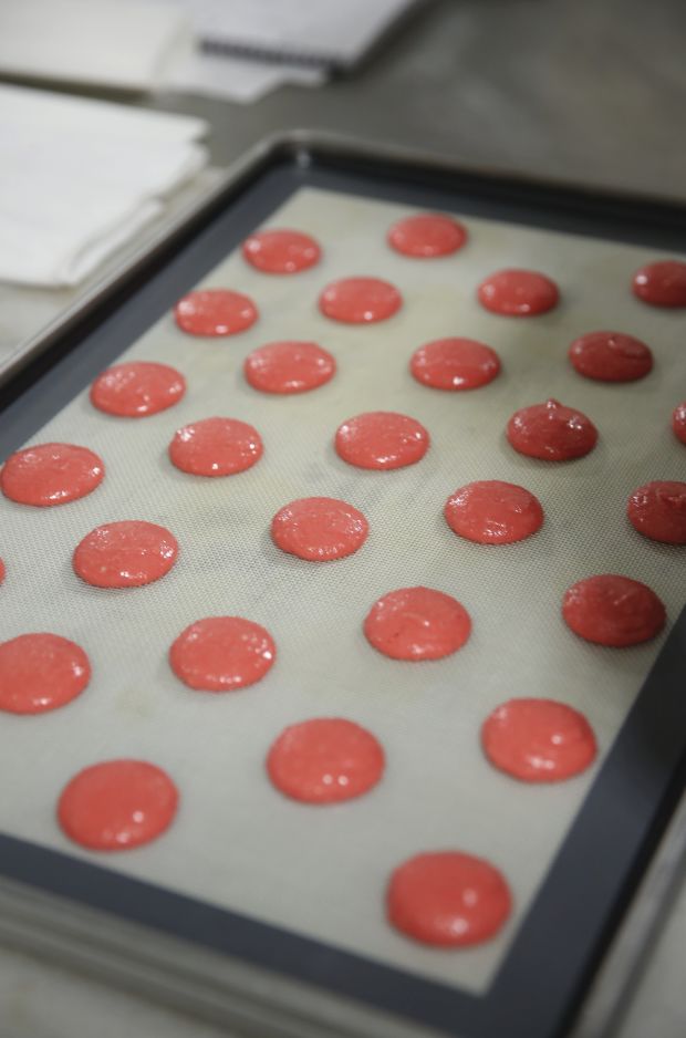 1. 马卡龙在烘烤前,需要将表皮晾干,否则顶部会出现开裂或者其他的问题,晾干的时间一般在30分钟到1小时之间,主要取决于室内的温度,通常判断表皮晾干的标准是:用手指轻按马卡龙表皮不沾手即可。
