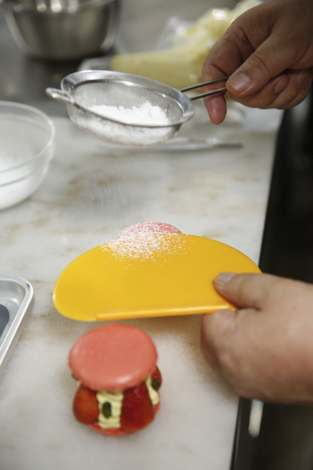 2、在马卡龙的周围贴上草莓块、开心果和蓝莓;用弧形软刮板遮住马卡龙一侧,筛上筛上糖粉装饰。