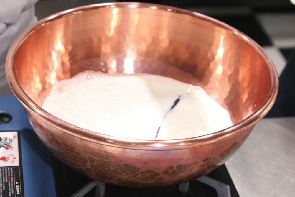 1、将香草荚和牛奶倒入锅中加热煮沸,去除香草荚。