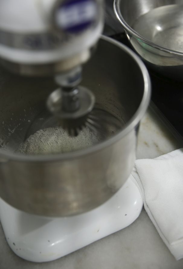 1. 将细砂糖、蛋白和干燥蛋白粉倒入搅拌桶中,打至中性发泡。