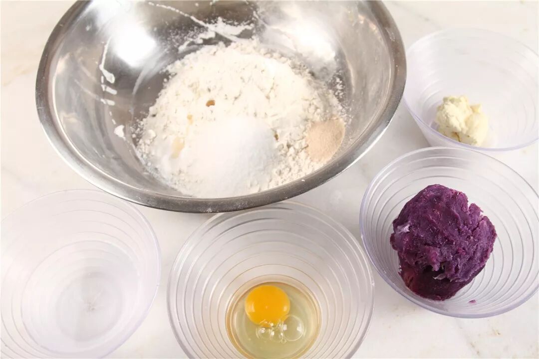 2.将原料放入打面缸慢速搅拌均匀,加入水搅拌成团。3.再快速打至面团光滑,用手能拉出薄膜,将面团取出揉圆放入烤盘,盖上保鲜膜发酵60分钟,分割面团成80g一个揉圆松驰。4.将松弛好的面团进行整形,用擀面杖将面团擀成长方形。8.将底部接口用手指捏紧,防止过度膨胀,将整形好的面包放入烤盘,进醒发箱最终醒发,醒发箱温度为35℃湿度为75℃,醒发1小时。10.将醒发好的面包在表面轻轻刷上蛋液,撒上紫薯丝装饰,进行烘烤,将平炉烤箱上火调为210℃下火调为190℃烤16-20分钟即可。