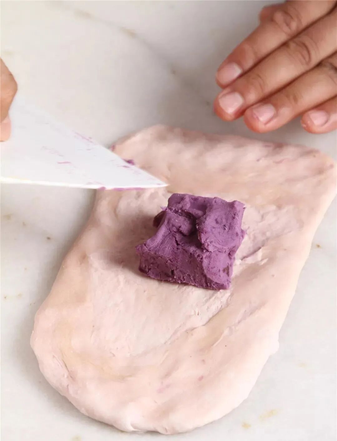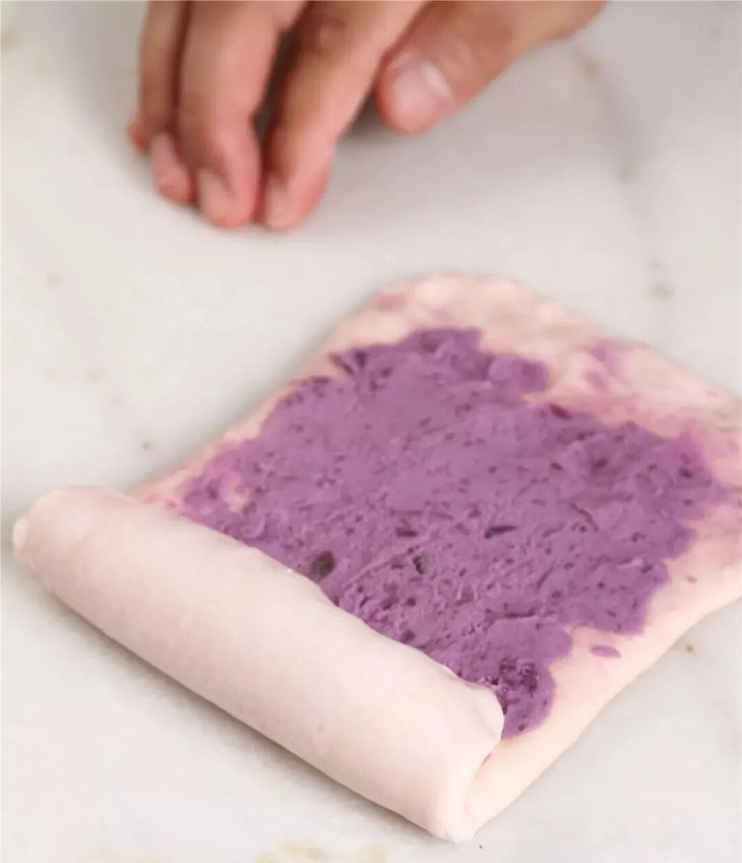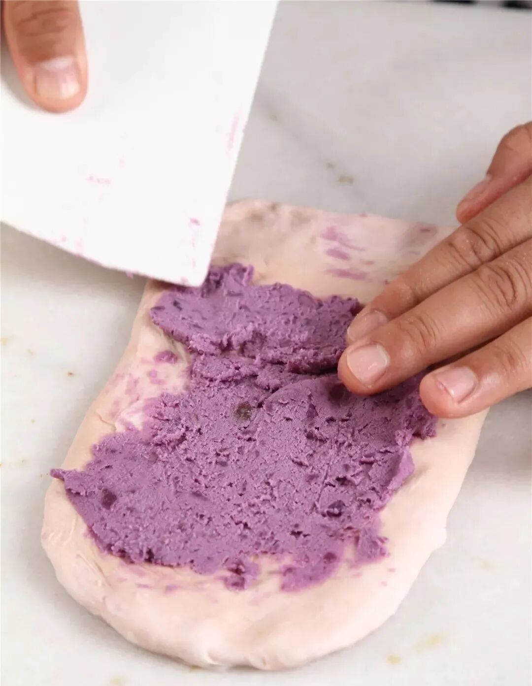 通常制作时选用抹茶绿,大麦若叶绿,黑醋栗紫、蜜桃粉、火龙果粉等来增加视觉效果;造型上,大大的一颗看着就有满足感;最重要的当然是丰富的内馅啦!利用时下热门的健康口味进行多元化的复合搭配:紫薯、芋泥、草莓、芝士、紫米、奶黄、肉松、坚果、麻薯……高颜值食欲满满的健康面包,老少皆宜~认识了软欧,就跟北京新东方烹饪大兴校区的老师一起来学习如何制作一款健康高颜值的紫薯软欧包吧~配方总计:572g , 可做 7 个