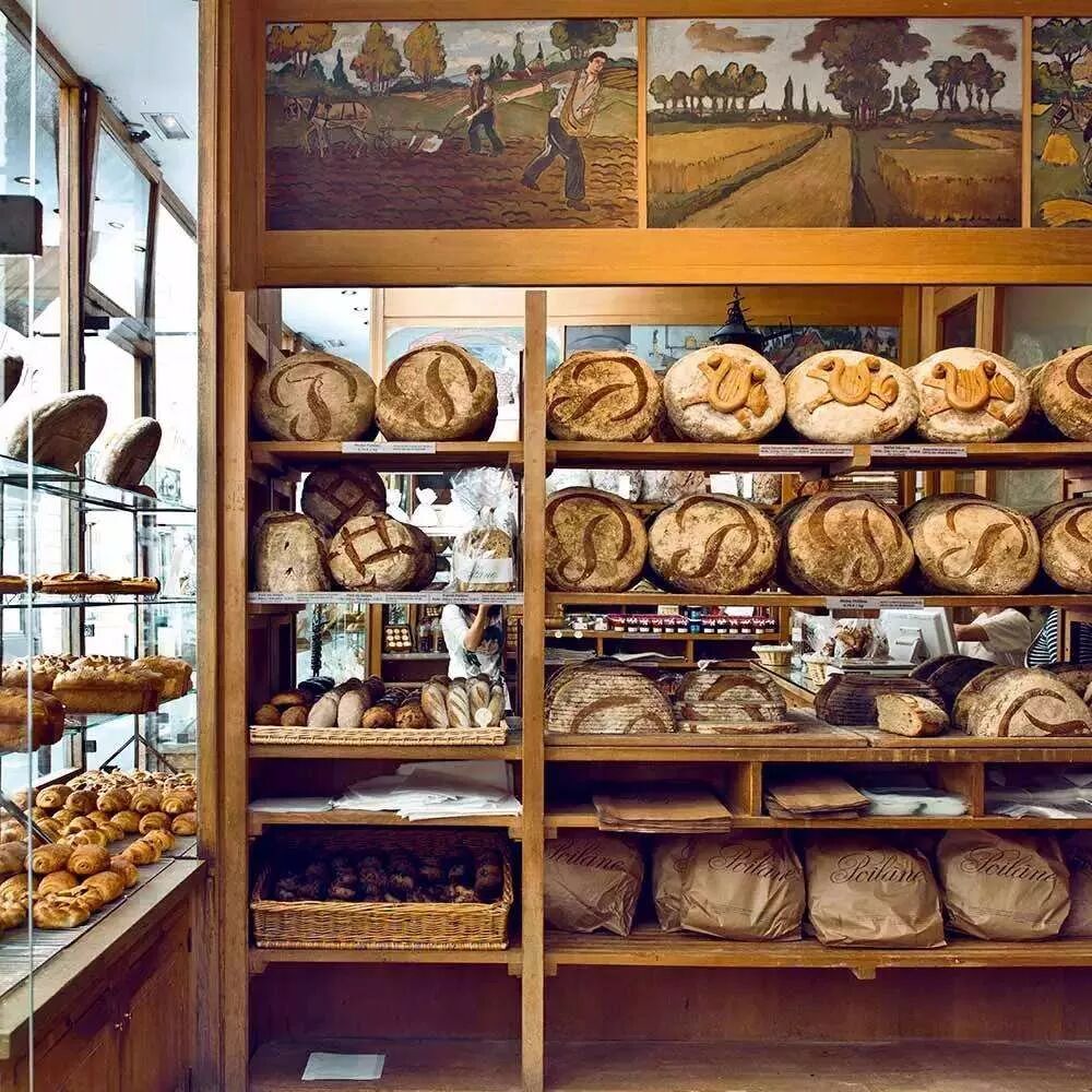 同样在欧式面包、法式面包遍地对的法国英国,相对有很多人的门店看上去根本没有什么精致的美感。它们会将面包很随意的摆放在柜台上,放置的位置也没有什么考究。只是在面包前面放一个价位表,就可以直接售卖了。有时会用上一些比如木头一类质感的材料来装修门店,让门店有一种粗糙当中展现细腻和情怀的美感。