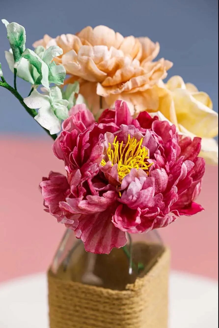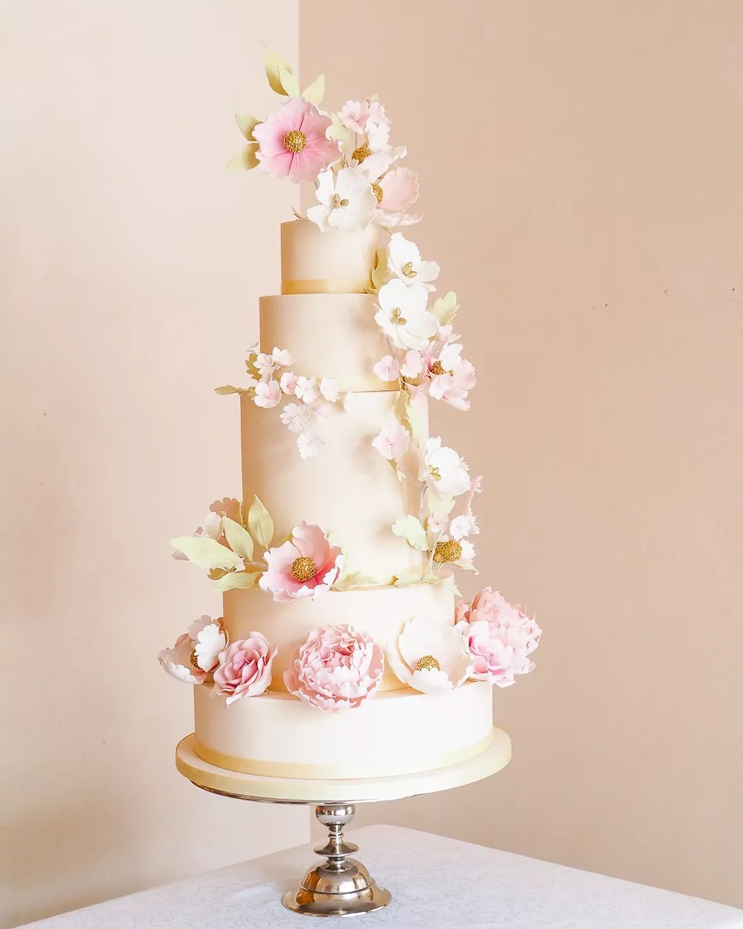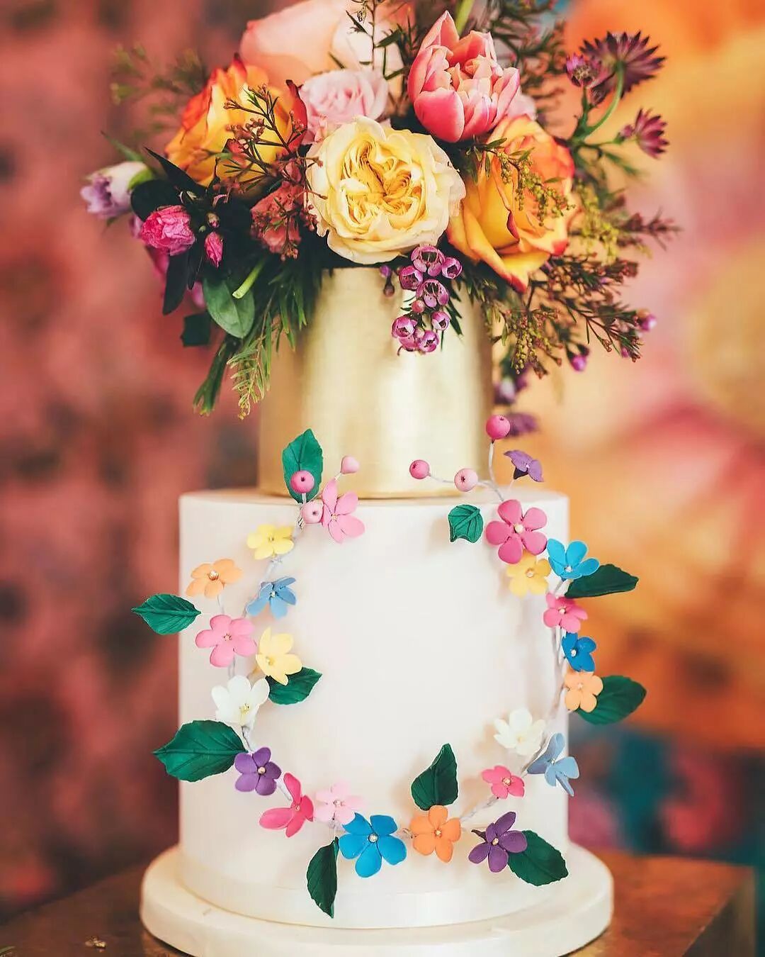 在网上看到很多翻糖爱好者在翻糖蛋糕上插花时一朵一朵地摆,这样不仅缺乏立体感,还破坏了蛋糕表面的完整度,影响食用时的体验。如果对插花有所了解,就可以和翻糖工艺结合,选用先将花枝捆成一束,再插入蛋糕中的方式去制作。