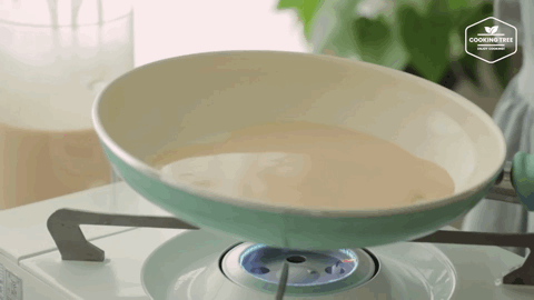 取千层糊倒入锅内,来回转动不粘锅,使液体均匀覆盖后,放下锅加热。