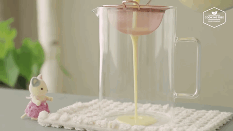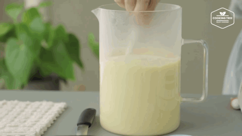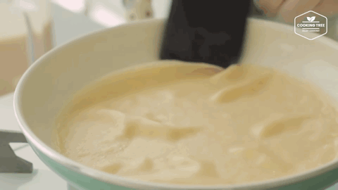 接着倒入400牛奶继续搅拌,再倒入融化的黄油搅拌均匀,千层饼糊就完成了~ 千层糊很简单,就是不断搅拌混合。
